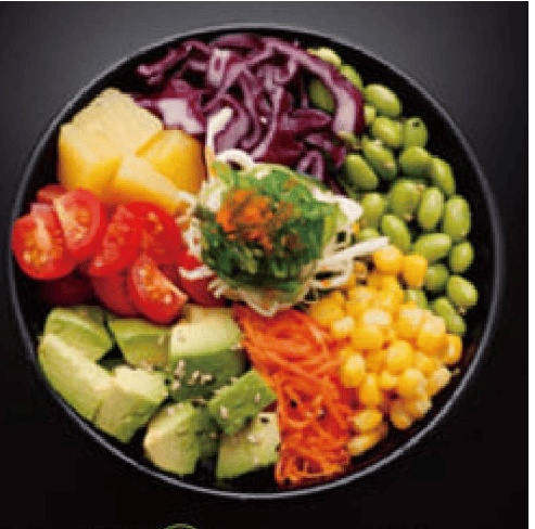riz vinaigré, carotte 🥕 , concombre betterave , tomate cerise 🍅, avocat 🥑, oignons frits .